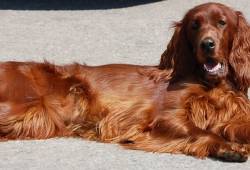 It is relatively easy to take care of the Irish Setters coat. The hair on their head, the front part of their legs and on the tips of their ears is quite short and thin. Other parts of their body are mostly covered with hair that is medium length, straight and shouldn’t be curly at all. The hair on their ears, or so-called “feathering” is somewhat longer and silkier. The back part of their front legs and on the hind legs, the hair is quite long and smooth, with a decent amount of hair on the belly which is forming a fringe that can reach all the way to their chest and throat.